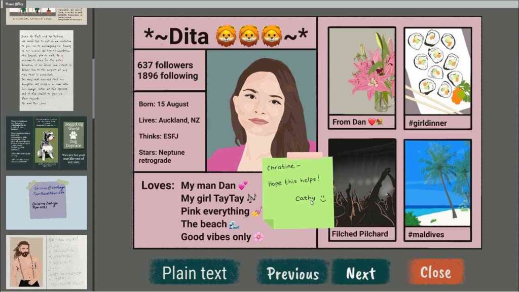 A The Ratline vagy a The Roottrees játékokkal ellentétben nincs küldetésrendszer, így ez egy tisztán deduktív játék. Örültem, hogy a történeti információkat darabokban, nem pedig egyszerre mutatták be, ami arra késztetett, hogy jobban odafigyeljek az egyes szereplőkre, és a történetszálaikra koncentráljak, ahelyett, hogy csak úgy kitölteném az információkat, hogy csak úgy kiegészítsem azokat.