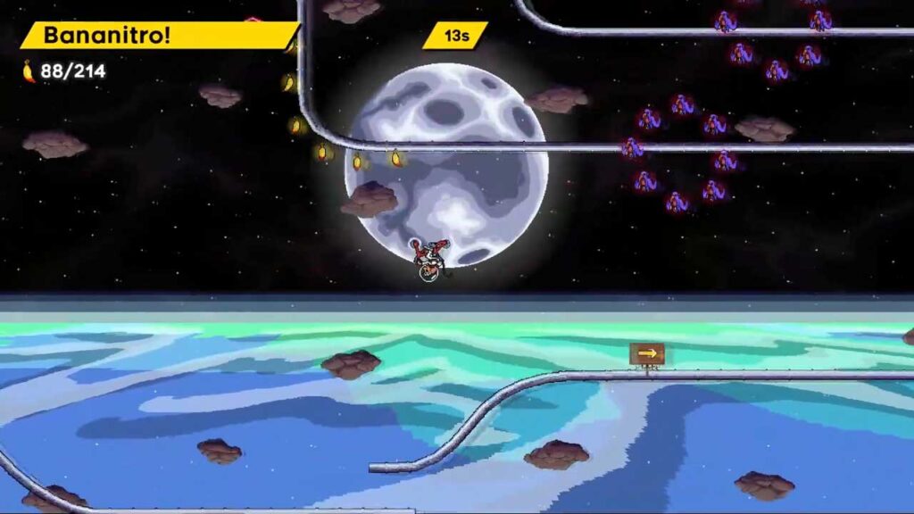 Maga a játékmenet meglehetősen érdekes és lebilincselő, minden kampány új elemeket és akadályokat vezet be, például a Holdon tapasztalható gyenge gravitációt, a csak gyorsítással áttörhető jeleket, és az ellenségek támadását a havas hegyekben. Csak két gombot használ – ugrás és BANÁN! (egy erős gyorsító, amely az útközben szedett banánokból felhalmozódott energiát használja fel), de még ez is elég egy izgalmas, nagy sebességű versenyhez.