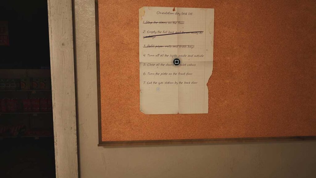 A játék története egy magányos munkás bőrébe bújtat, aki napkelte előtt próbál bezárni egy boltot – de valami nem stimmel. Minden este be kell zárnod a benzinkutat. Meg kell győződnöd arról, hogy minden lámpa le van kapcsolva, az üzlet makulátlan, és minden ajtó zárva van. Ami egy rutinszerű takarításként indul, gyorsan nyugtalanítóvá válik a furcsa zajok, a villogó fények és a környezetedbe beszűrődő finom anomáliák miatt.