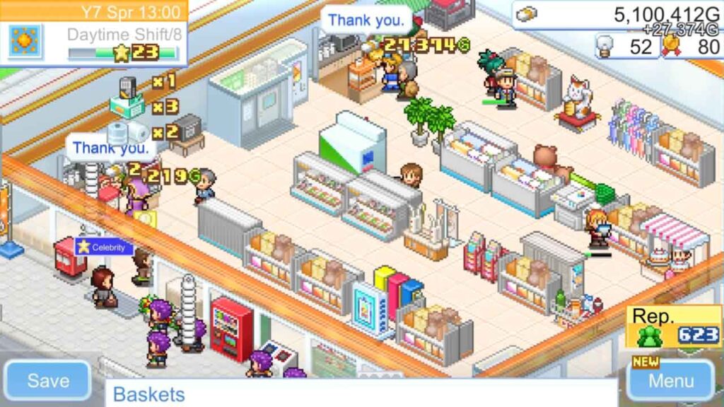 Eleinte szó szerint minden nap csődbe mentem, csak hogy árut vegyek. Nagyszerű lett volna, ha lett volna egy gomb a takarításhoz. A padlót polcok zárták el, és nem láttam jól. Ráadásul a bolt padlója nagyon koszos volt a sok jövés-menő vásárló miatt. Nagyon zavart… de ettől függetlenül szórakoztató. Miután a következő lépésben mindent elrendeztem, nagyon szórakoztató nézni, ahogy a kis emberek vásárolnak. Ez a játék nagyon gazdag tartalommal és minőséggel rendelkezik, és a játék visszarepít a gyermekkorba. Ha szereted a Kairosoft játékait, vagy érdekelnek az üzleti szimulációk, érdemes kipróbálnod.