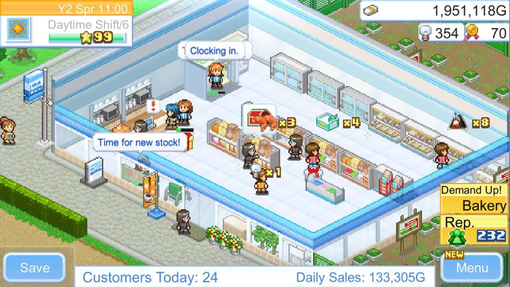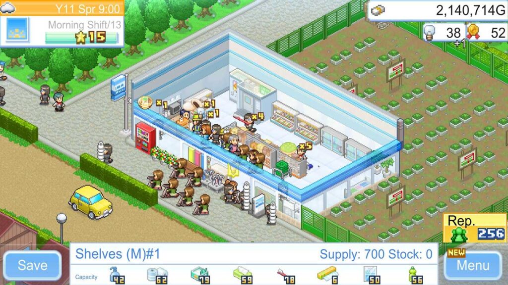 Valójában az Ön által vezetett üzlet éjjel-nappal nyitva tart, és mindenféle árut kínál az embereknek. Ennek a játéknak néhány irányítási szempontja még mindig meglehetősen finom, ugyanakkor a Kairosoft játékok különleges összetettsége továbbra is fennáll.