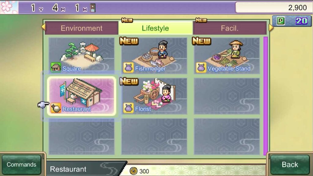 A játék elején egy Minako Fukuhara nevű karakter elvezeti Önt, hogy építsen több házat, mert így több karaktert vonzhat be a házatokba. Azt is elmagyarázza, hogyan kell kutatásokat végezni, amelyeket bizonyos épületek, például templomok vagy fürdők építésére használnak.