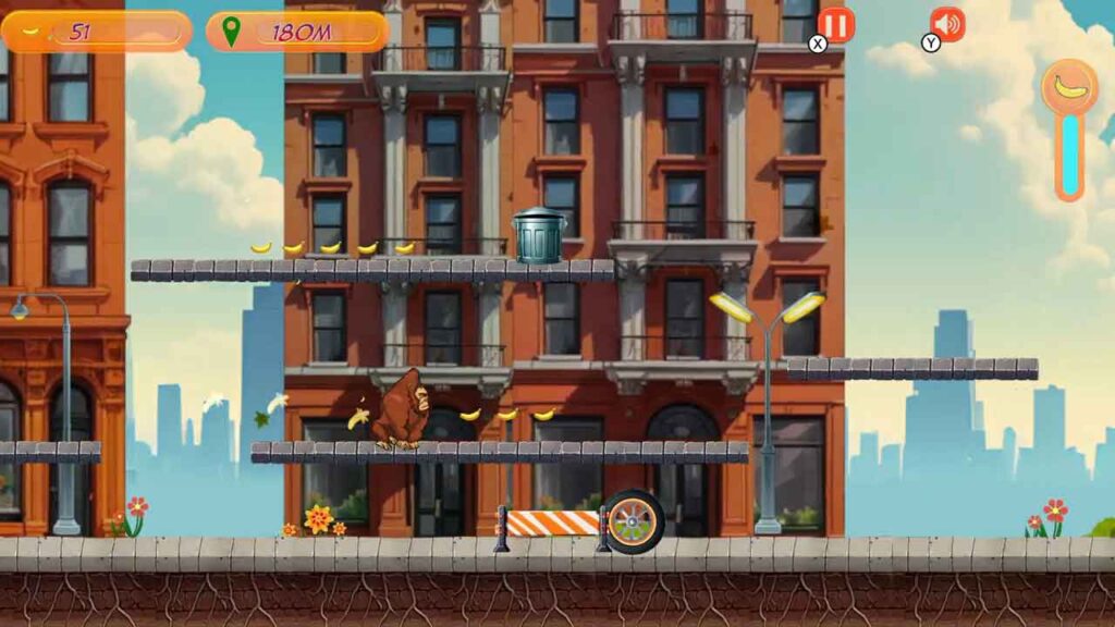 Ha megnézzük a játék grafikáját, észrevesz egy banánmérőt, amelynek létfontosságú funkciója van. Mivel ez egy automatikus futós játék, mindig futnod kell, és ahhoz, hogy futni tudj, mindig tele kell tartanod a banánmérőt. Természetesen nyilvánvaló, hogy az előtted álló út nem lesz veszélytelen, és számos akadályba ütközöl majd útközben. Ezek közé sorolhatnám a guruló gumiabroncsokat, a csúszós dokkokat, a forgó darukat és más gorillákat, amelyek mindegyike korlátozza a mozgásodat.