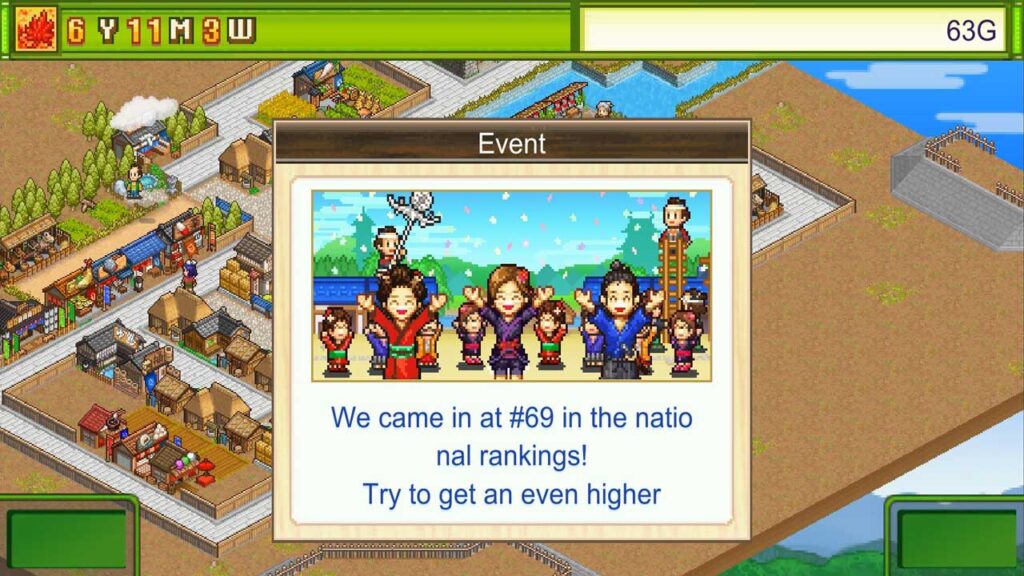 A játékmenet meglehetősen kielégítő, és a fő téma nagyon érdekes. A cél az, hogy pénzt keressen, és növelje az elért bevételt, és hogy az első legyen Japánban. A falusiak szakmájukat gazdára, kereskedőre, kézművesre vagy harcosra válthatják. Különböző épületkombinációk különleges jutalmakkal is járhatnak. A kézművesek kézműveskedhetnek, és úgy tűnik, hogy a kézműves receptek véletlenszerűen jelennek meg. A falusiak fogyasztása mellett a szállodai állomás építése lehetővé teszi, hogy több ember jöjjön a területére, ami természetesen növeli a bevételét, ha többen lépnek be a városba.