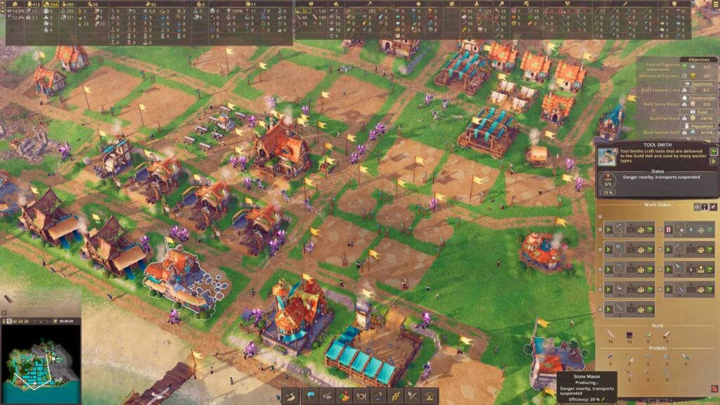 Ami nem tetszik a Pioneers of Pagoniában, az a kezelőfelület. Nem lehet ablakokat húzni, mindent furcsán nehéz elhelyezni. Az ablakokon belüli elrendezések önkényesnek érződnek. De ami a legjobban idegesít, az az erőforrás-áttekintés. Csak egy órára visszamenő grafikonok vannak, már nem lehet időszakok között váltani. És nehezen találok bármit is a felső sávban. Jobban szeretem a kis ablakokat, mint a régi Settlers 2-ben, amelyeket elő tudok húzni és magamnál tartok, kicsit modernebb módon (szűrés és keresés/kiválasztás). Gondolom, az emberek ezt a tapasztalatot más stratégiai játékokból is használhatják, de nekem nem működik túl jól.