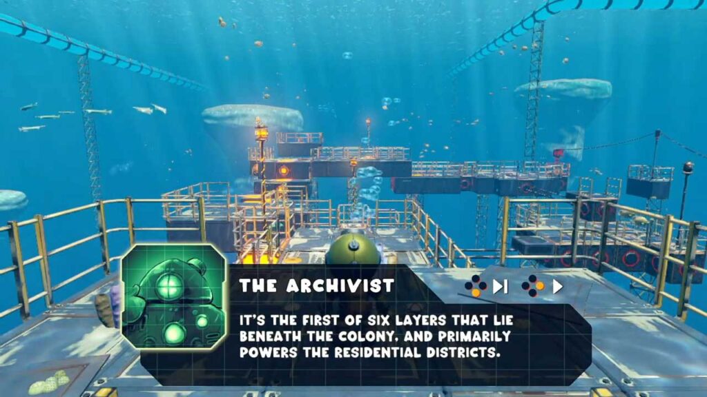 A rövid bevezető nem sokat árul el. Magányos búvárként merülsz mélyen a vízbe, hogy visszaállítsd az oxigénellátását vesztett elsüllyedt kolónia áramellátását. Ahelyett, hogy szabadságot adna, a Power Sink lineáris előrehaladást kínál a szinteken keresztül. Minden egyes feloldott szintet egy egyszerű szintválasztó szobában keresztül térhetsz vissza, ahol csak egy térkép és egy búvárharang található, de minden szintet be kell fejezned az új készletek feloldásához. Bár az újrajátszhatóság lehetséges, kevés ösztönző van a visszatérésre, mivel nincsenek titkok vagy gyűjthető tárgyak.