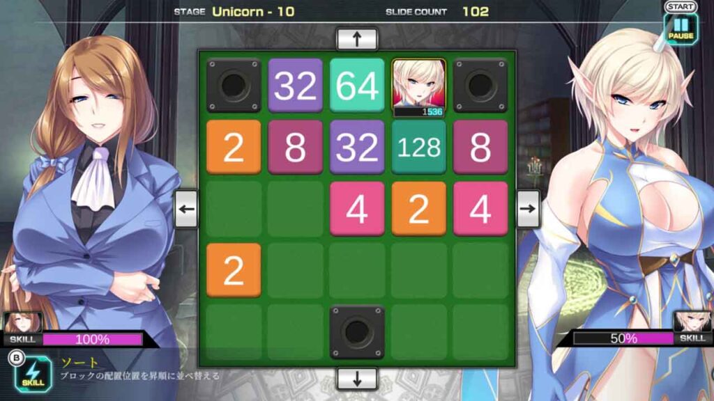 Az érdekesség az, hogy a 2048-as kirakós játékban használt karakterek képességei eltérőek, és bármikor aktiválhatók, amíg ott van a mérő. Ha megütöd az ellenség négyzetét a számmezővel, és a HP-t 0-ra állítod, akkor nyersz. A színpadi módban összesen 5 fő szint van, és mindegyik szint 10 miniszintből áll, amelyek célja az ellenség legyőzése. Ha eltalál egy ellenséget egy számrács segítségével, az a rácson belüli számmal egyenlő sebzést okoz. Tehát amikor a megmaradt vér mennyisége alacsony, először nagy számmal megütheti a környező blokkokat, és nincs szükség a szintézis folytatására.