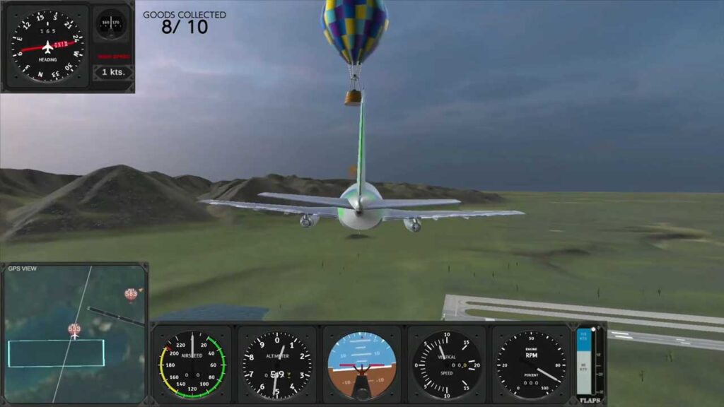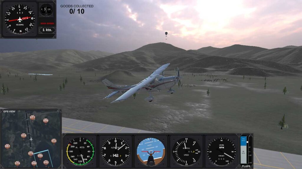 Szerencsére, ha most kezded, vagy csak egy hobbijátékos vagy, akkor semmire sem lesz szükséged ahhoz, hogy élvezd ezt a szimulátort. És ami a legfontosabb, jó eszközkészletet kínál a kezdéshez és a repülés megtanulásához. Az első két küldetés könnyű, és megtanít fel- és leszállni. A többi kezdőknek való, de én körülbelül 5-6-szor zuhantam le a géppel, hogy átjussak rajtuk (nincsenek ellenőrzőpontok…). A játék minden szakaszában csak egy célod van: értékes árukat gyűjteni a vibráló léggömbök alatt, miközben ügyesen irányítod a repülőgépedet a folyamatosan változó égbolton.