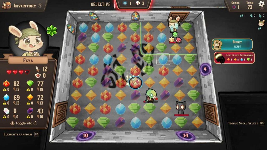 A játék energiarendszere nagyon érdekes. Az energia megszerzésének fő módja a blokkok párosítása. Ezeknek a blokkoknak azonban a karakter vonzerején belül kell lenniük ahhoz, hogy megszerezhetők legyenek, ami a mozgás és az illesztés okos kombinációját hozza létre. A karakter mozgása blokkokat cserél, és minden karakter egyedi tulajdonságokkal rendelkezik, amelyek reagálnak a szomszédos blokkokra. Merész ötlet, hogy sakkfigurákként használjuk őket a Match-3 párosítások teljesítéséhez.