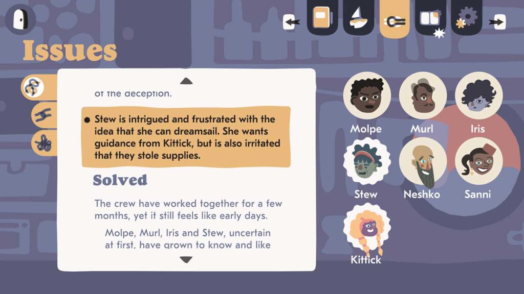 A Mutazione-val ellentétben a Saltsea-ban nem főszereplőként játszol, hanem válthatsz a legénység tagjai között, akik közül gyakran választhatsz. Rengeteg olyan döntést kell meghozni, amelyeknek valódi következményei vannak, bár abból, amit összegyűjtöttem, ezek nem lehetnek jók vagy rosszak, és csak különböző történetekhez vezetnek az út során. Saltsea világa szélesebb és összetettebb. Hatalmas mennyiségű párbeszéd található a könnyen elérhető évadismétlésekben, amelyeket különböző mentésekre oszthat fel. Van egy kártyajáték is, amit általában nem szeretek, de meglepően egyszerű és más a helyszín (és ráadásul teljesen opcionális).