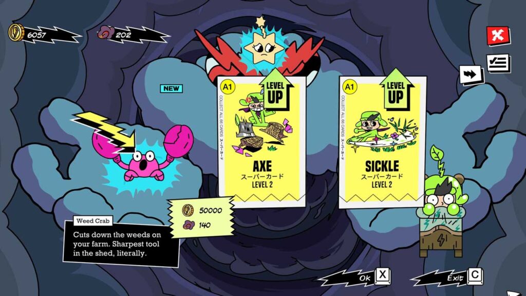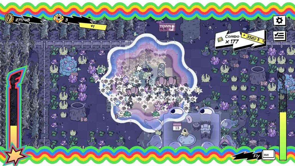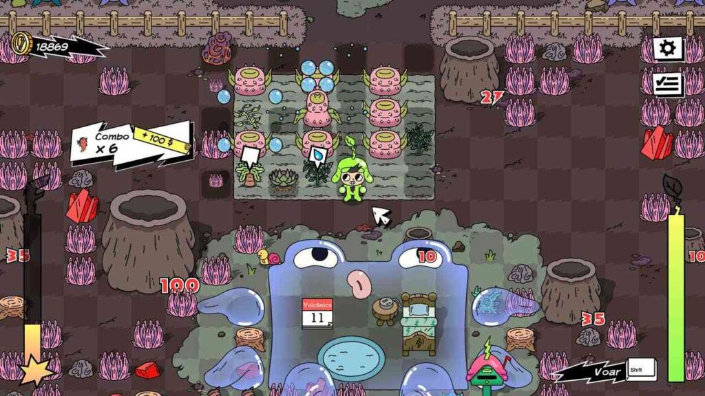 Egy másik kiemelkedő funkció a kombórendszer: miután magokat vásárolsz, imádnivaló “magvarázs lények” követnek majd a farmon. El kell kapnod őket, és stratégiailag el kell ültetned őket a kombók aktiválásához. Minél több kombót láncolsz össze, annál több pénzt keresel, és annál gyorsabban telik meg a lázmérőd. Aktiváláskor a lázmérő lehetővé teszi, hogy a terményeket azonnal betakarítsd az érésük után, és lehetővé teszi, hogy a kombókat spammeld, amíg a hatás el nem múlik. Ez a mérő minden nap visszaáll, így nem tudod átvinni a következő napra. A kombók segítenek az akadályok és a növényeket károsító rovarok leküzdésében is.