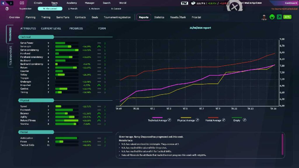 Azok számára, akik semmit sem tudnak a teniszről (mint először én), sok szakkifejezést magyaráznak és illusztrálnak, ami nagyon tanulságos. Csak időt kell szánnod és olvasnod kell, hogy tudd, merre jársz. Még akkor is, ha néha meg kell keresni vagy meg kell találni a magyarázó buborékot: a játékos attribútumainál a buborékok az általános lapon vannak, és nem a jelentésben. Valójában a nagy javulás az edzés terén van, a tulajdonságok, a hangulat és a forma hatásai elképesztően jobban kifejthetők, és azoknak, akik lusták saját edzésprogramjukat felépíteni, hatalmas előrelépés a kész programokban (nagy választék) hozzáférési lehetőséggel Vannak speciális funkciók. A játék során tippeket is kapsz az asszisztensektől, hogyan fejlesztheted a játékos játékát.