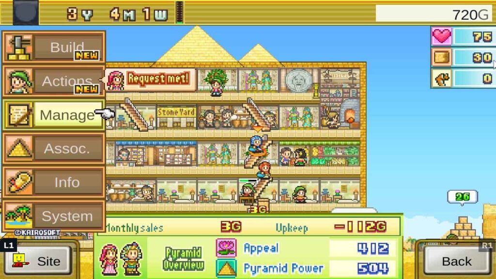 The Pyraplex nagyon hasonlít a Kairosoft által készített többi épületkezelő játékhoz, de ezúttal egy gyönyörű ókori egyiptomi témával ötvözték; egy szórakoztató üzletépítő játék, amely arra ösztönöz, hogy egy igazi piramist építs, ami szerintem egy érdekes ötlet. A Pyraplex az ókori egyiptomi civilizációt, a négy ókori civilizáció egyikét használja háttérként, hogy saját egyiptomi csodákat alkosson, és sok turistát vonz. Nagyszerű játék a figyelmed elterelésére és a vezetői és végrehajtói készségeid fejlesztésére.