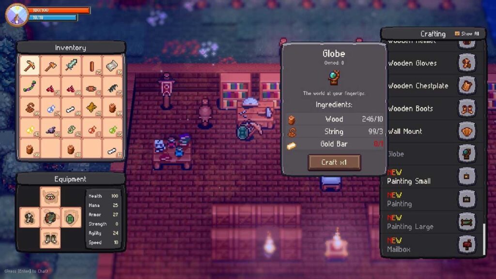 A Tinkertownban többnyire gyalogosan fedezheted fel a játék világát, építhető gyorsutazó állomások (amelyek nem igazán érik meg a fáradságot) és a bázisra való gyors visszatéréshez szükséges bájitalok teleportálásával. A begyűjthető felszerelés korlátozott mennyisége miatt ez állandó ingázás. A nem fejleszthető felszerelés elenyésző ahhoz képest, hogy mennyi dolgot szerezhetsz harcból, betakarításból és ládákból.