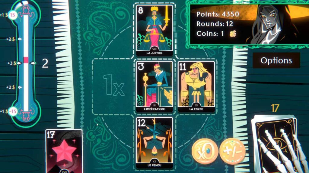 A XIII. Tarot utolsó játéka eleinte nagyon nagylelkű, ezért tegyél meg mindent, hogy érméket gyűjts a későbbi körökre. Az érmék vásárlásával szerzett erős tárgyak a szerencse irányításának eszközeiként szolgálnak, lehetővé téve, hogy a táblán lévő kártyákat váltogasd, és stratégiailag kezeld az erőforrásaidat, hogy növeld a pontszámodat és tovább juss, mint korábban.